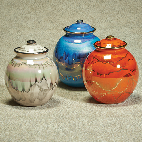 Hand-thrown ceramic with a luminescent finish created from a glaze containing 22k gold. Top-opening lid. Shown with optional engraved metal easel.